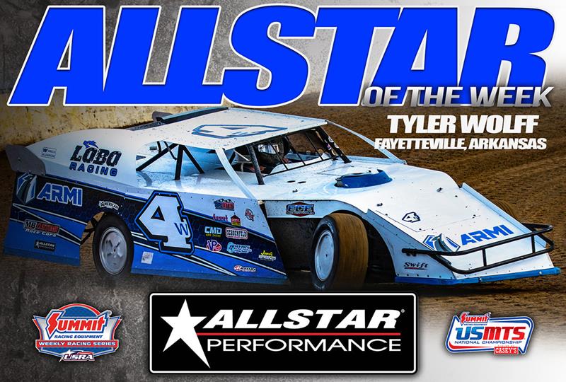 Tyler Wolff of Fayetteville, Ark., is this week's Allstar Performance Allstar of the Week. He crushed the competition in Joe Duvall's Funkadelic Dirt Track Honky Tonk & Extravaganza. Wolff swept the weekend with three victories in his USRA Modified at Oklahoma's Red Dirt Raceway in Meeker, Creek County Speedway in Kellyville and Outlaw Motor Speedway in Oktaha.